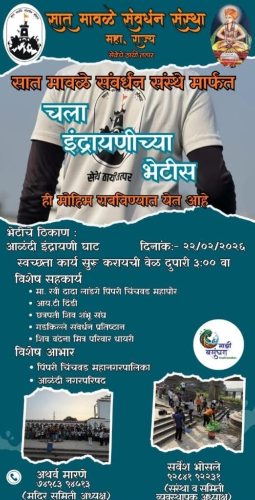 सात मावळे संवर्धन संस्थेतर्फे रविवार दि.२२ फेब्रुवारी रोजी दुपारी ३ वाजता पासून श्रीक्षेत्र आळंदी देवाची येथील पवित्र इंद्रायणी घाटावर इंद्रायणी स्वच्छता व संवर्धन मोहीम आयोजित करण्यात आली आहे.