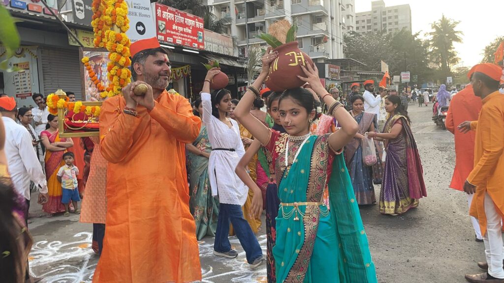 सुरुवातीला नववर्ष स्वागत समितीच्या वतीने परिसरात भव्य शोभायात्रा काढण्यात आली. ढोल-ताशांच्या गजरात निघालेल्या या यात्रेत कलश यात्रा, प्रभू रामाची पालखी आणि पारंपरिक वेशभूषेतील लहान मुले पूर्णवेळ आकर्षणाचे केंद्र होती. एका लहान मुलीने ‘वासुदेव’ वेशभूषेतून केलेले सामाजिक प्रबोधन उपस्थितांची दाद मिळवून गेले. पारंपरिक वेशभूषेतील सर्व बालगोपालांचे पुष्पवृष्टी करून स्वागत करण्यात आले.