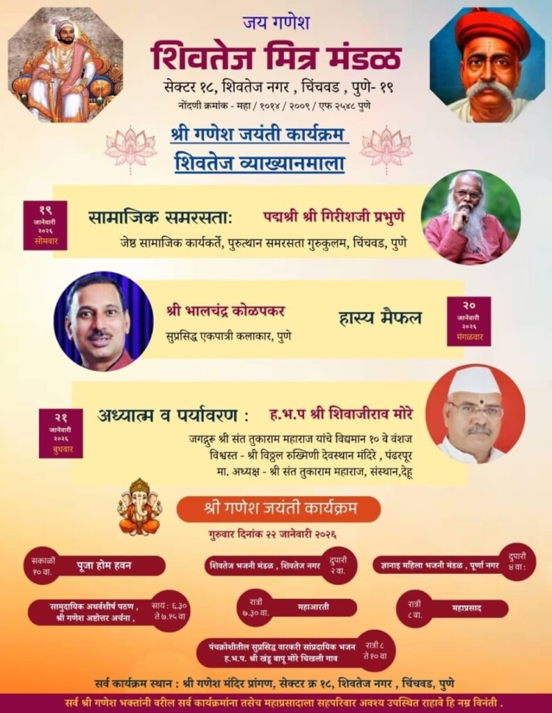 जय गणेश शिवतेज मित्र मंडळ सेक्टर १८ शिवतेज नगर चिंचवड, पुणे यांच्यातर्फे श्री.गणेश जयंतीचे औचित्य साधून शिवतेज व्याख्यानमालेचे भव्य आयोजन श्री गणेश मंदिर प्रांगण सेक्टर १८, शिवतेज नगर या ठिकाणी दि.१९ ते २१ जानेवारी पर्यंत रोज सायंकाळी ७.३० वाजेपासून करण्यात आले आहे.